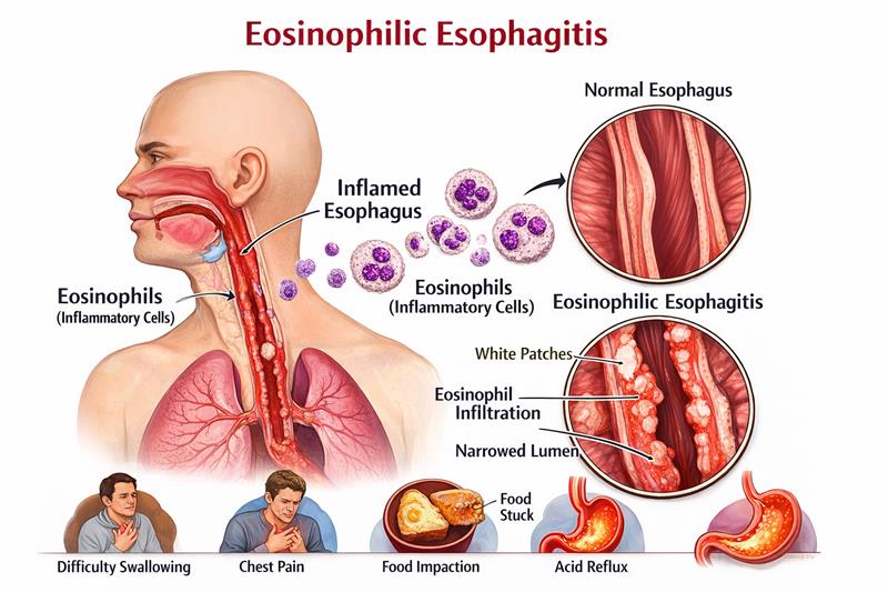 EoE is a chronic, immune-mediated inflammatory disease of the esophagus, often triggered by food allergens or environmental factors. Though increasingly recognized, it’s still considered rare, affecting roughly 1 in 700 to 1 in 2,000 people.